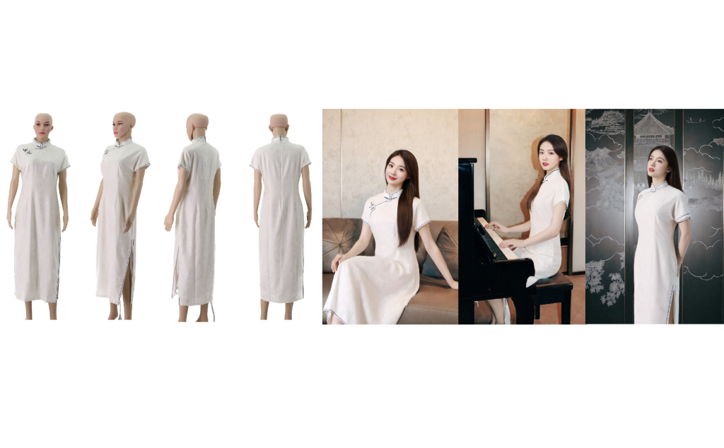 输入单品人台图,与商品描述关键字,就可借助AI智能生成虚拟模特服饰搭配图,并且模特和背景均可替换,实现不同产品角度、光照、背景、版式等设计一次完美生成,充分满足商家对于素材的个性化需求。